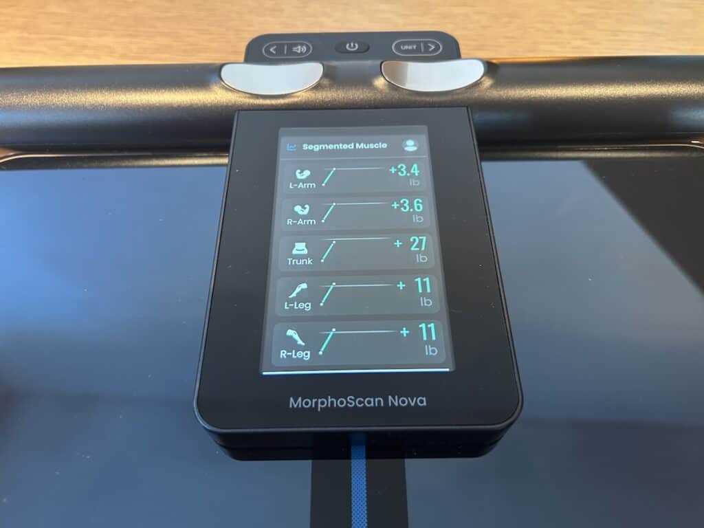My favorite feature, however, is the Segmental Analysis right on the display. You can see a breakdown of your limbs and torso with short trend arrows indicating if the numbers are going up or down. As someone who is short-sighted, having this level of detail right in my hands without needing to squint at the floor or grab my phone is a game-changer.